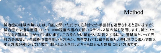 他にも刺入せずに皮膚に接触させたり押圧させたりする方法もあり、これらは小児鍼として乳幼児の夜尿症や夜泣きなどに効果があります。