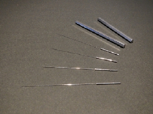 画像上の2本が金属管、下4本が実際に治療で使う鍼
